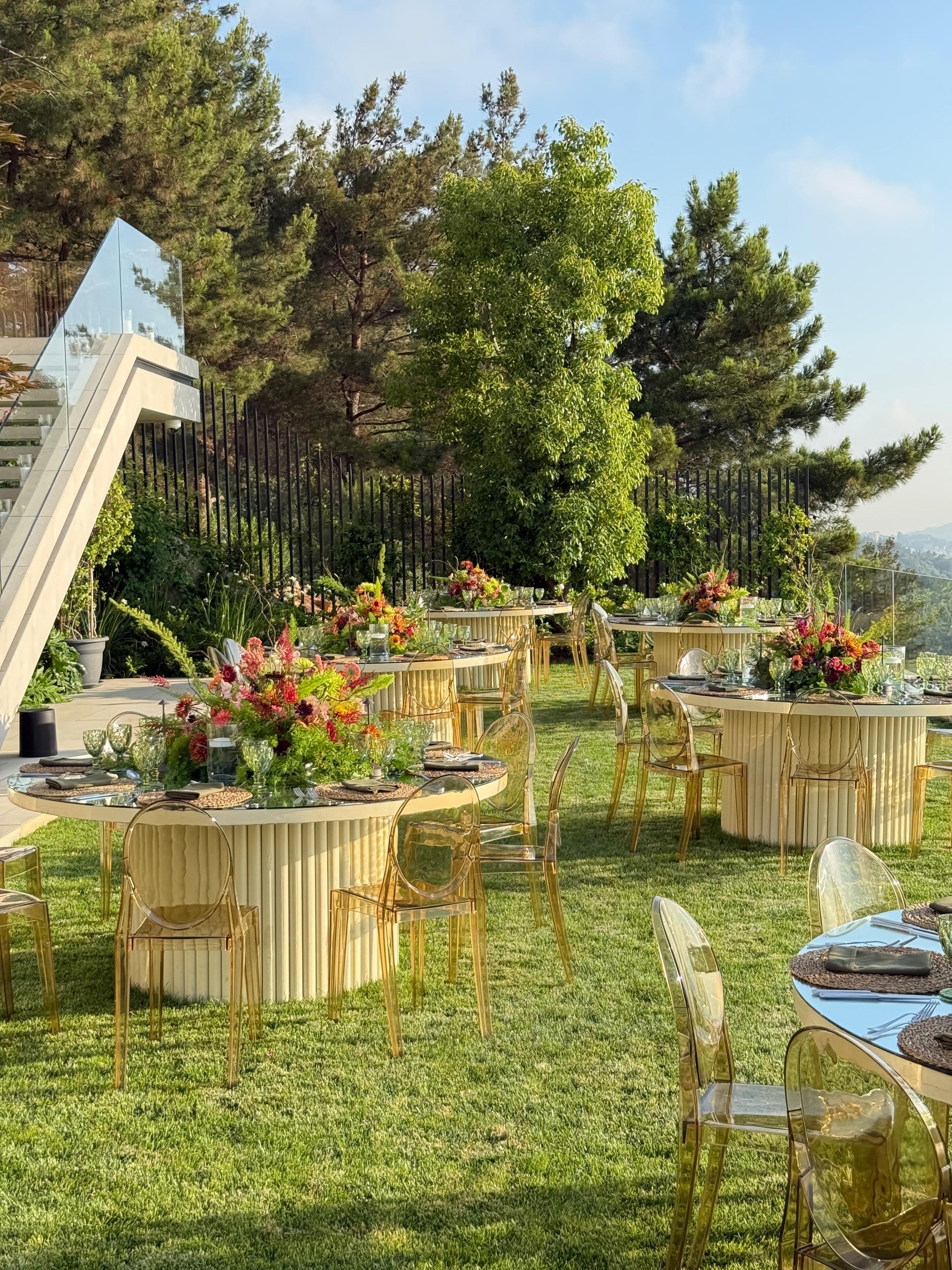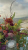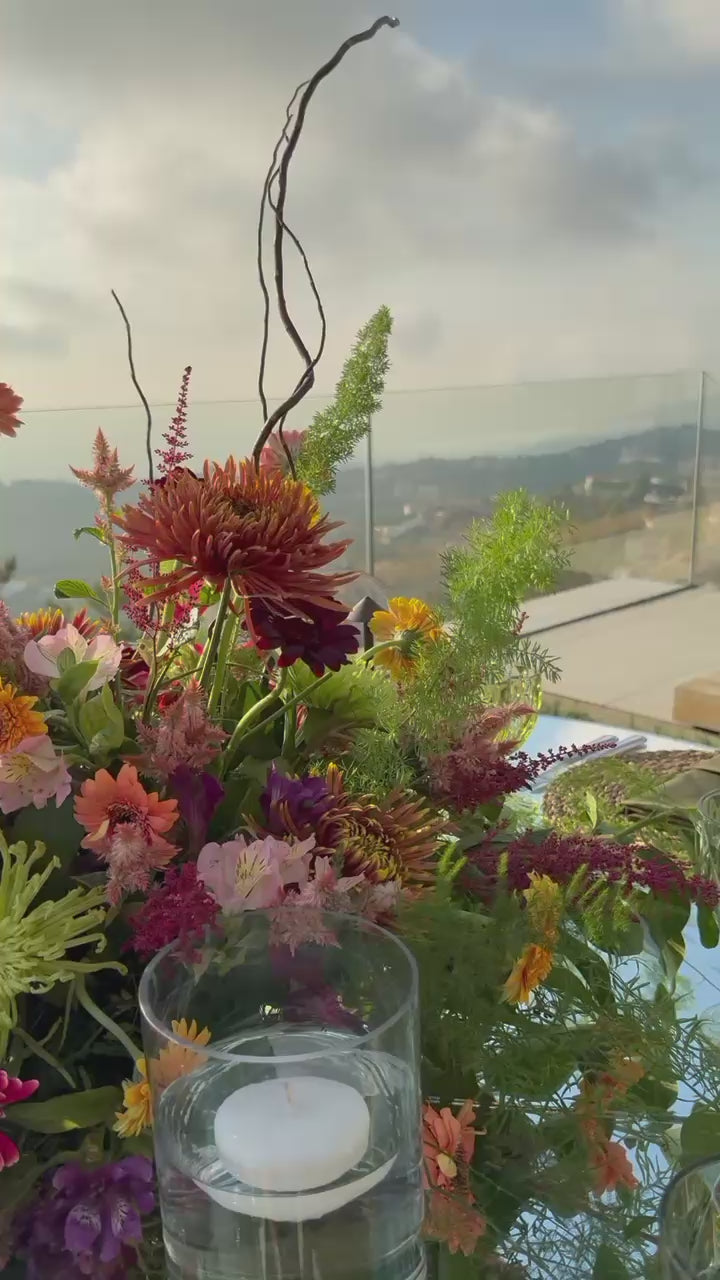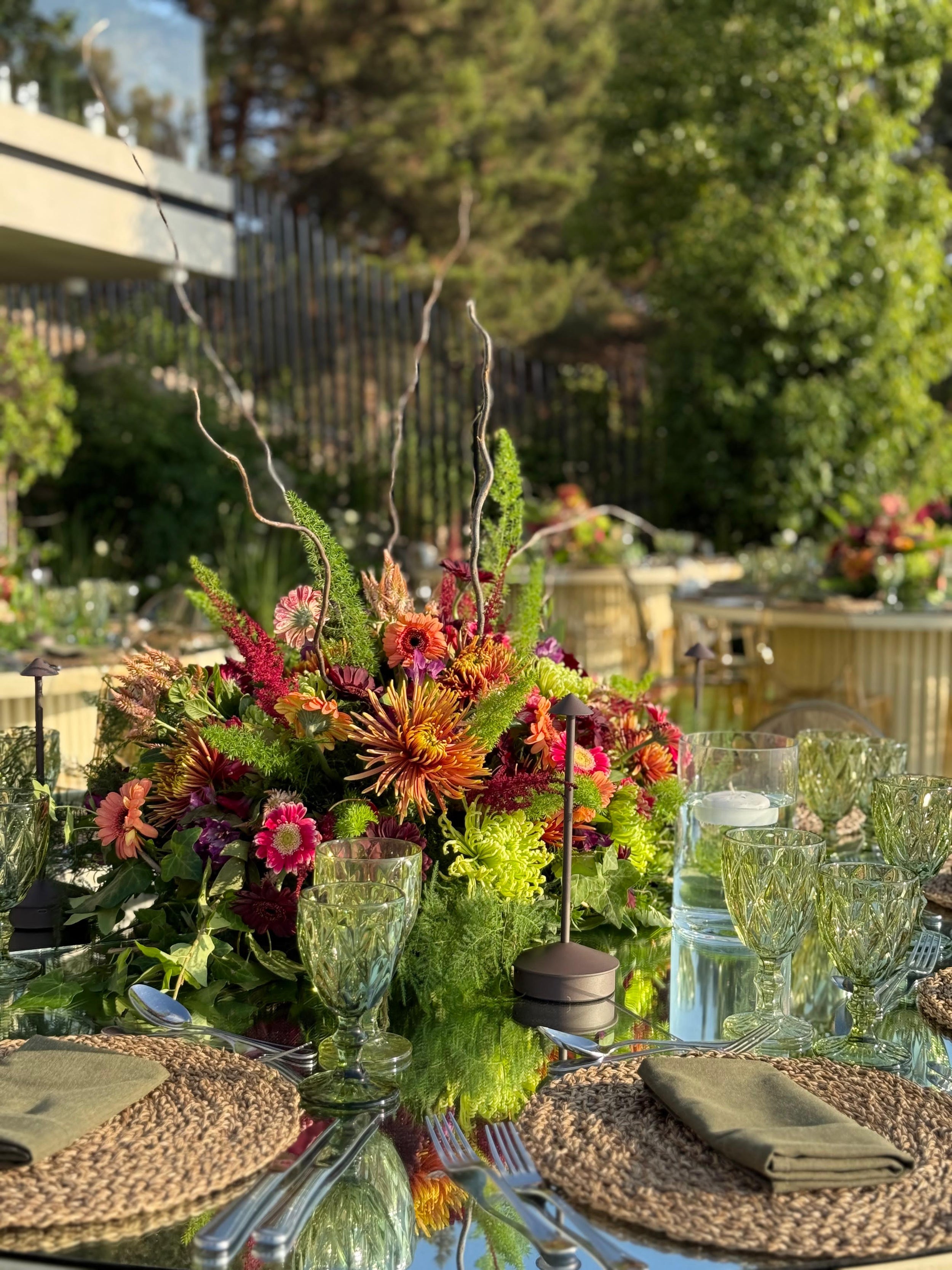 Bursting with bold color and lively texture, this tablescape brings an energetic elegance to an outdoor setting. Layers of fuchsia, tangerine, chartreuse, and deep berry florals bloom from a bed of fresh greenery, while woven chargers and olive-toned napkins ground the look in natural warmth. Reflections from the mirrored tabletop amplify the light and color, creating a glowing, immersive experience. Designed for golden-hour gatherings filled with joy, connection, and celebration.
