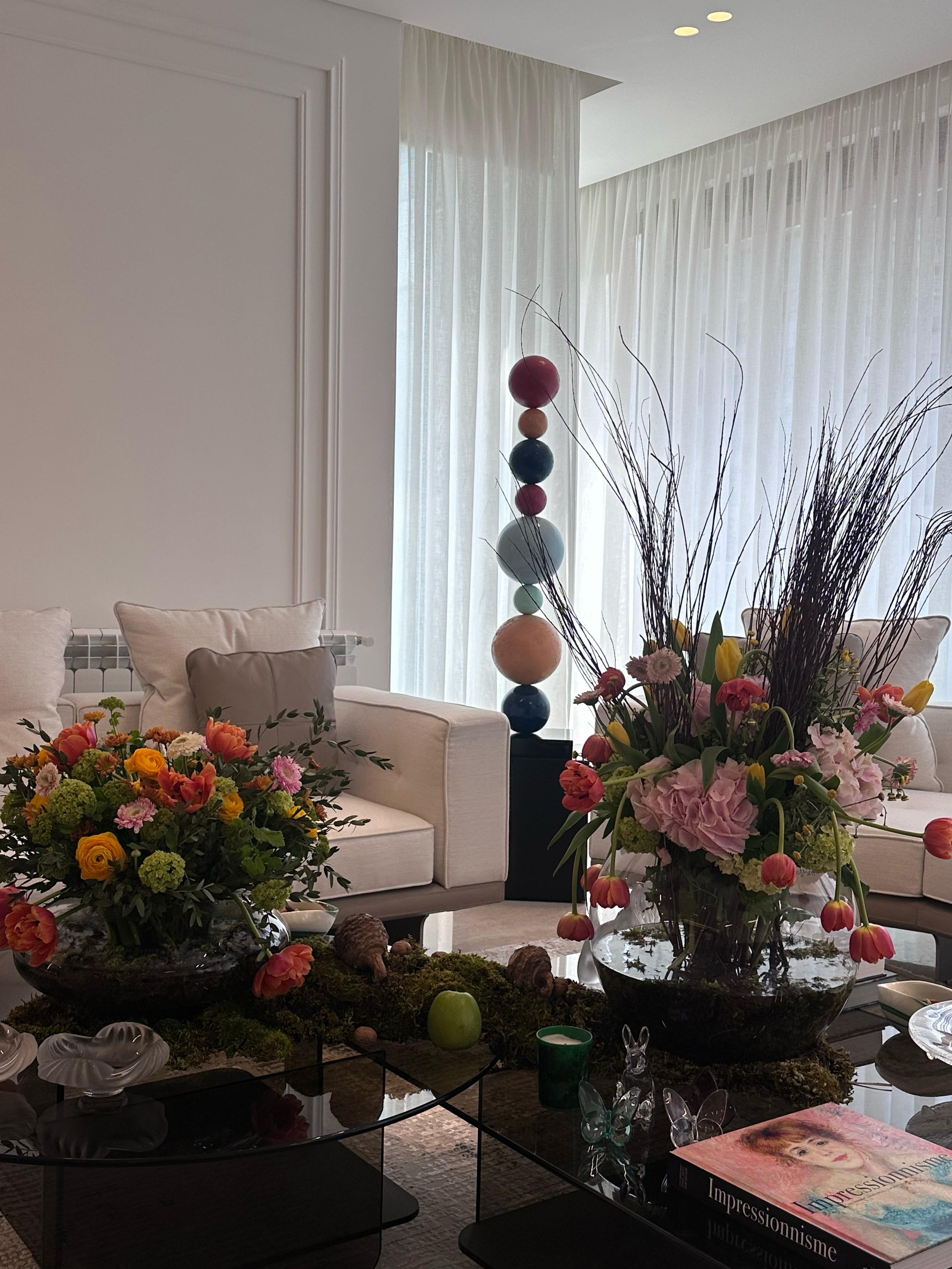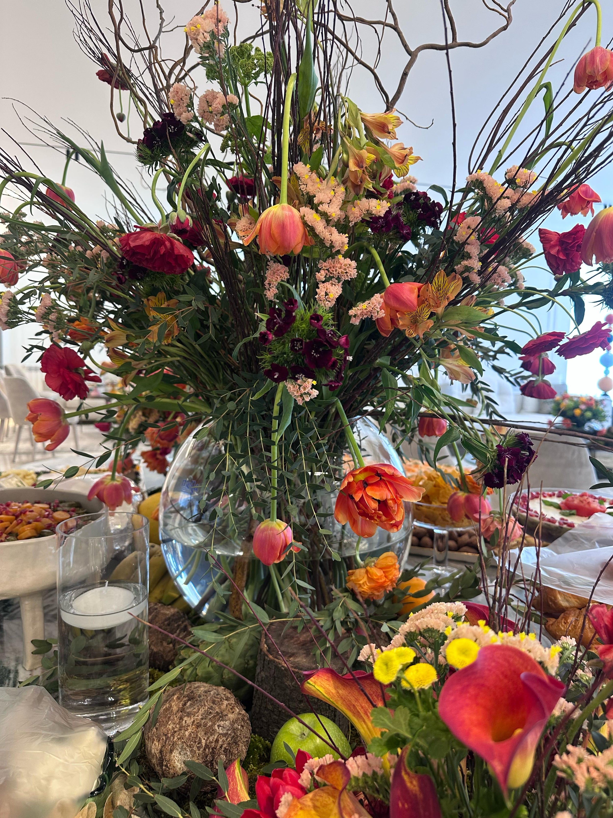 A bold and abundant arrangement designed to impress. Overflowing with vibrant florals in deep reds, oranges, and soft blush tones, this tablescape brings energy and elegance to any gathering. Twisting branches add height and drama, while layered textures and seasonal blooms create a sense of movement and richness. Paired with a curated buffet of savory and sweet delights, this setup transforms the dining experience into a visual and sensory celebration.